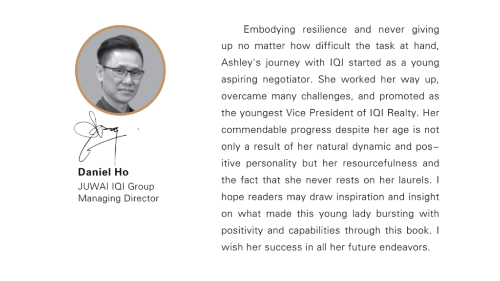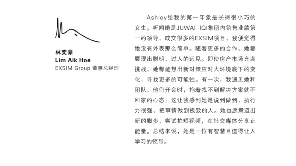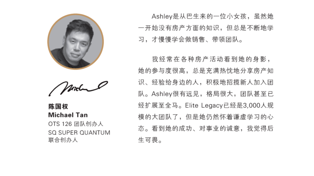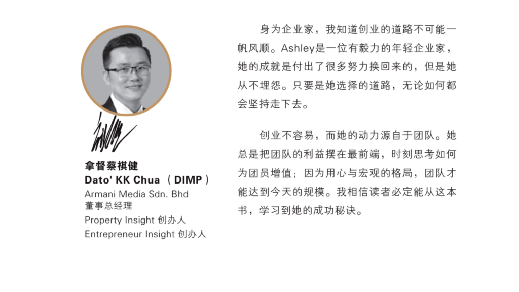 她从一个怀揣梦想却毫无经验的年轻人,跌跌撞撞踏入房地产行业。在不断的摸索与挫折中,她一步步学会了如何精准投资房产、如何真诚面对客户达成销售、又如何凝聚团队不断突破业绩极限。短短五年,她从零开始,不仅打造了一支3,000人的精英团队,更累计达成了40亿令吉的房产销售额。